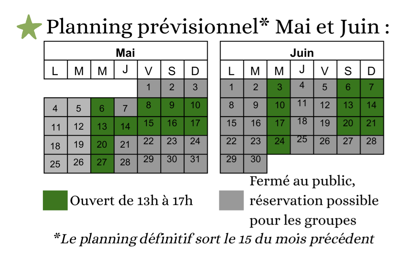 Le planning définitif sort le 15 du mois précédent mais vous pouvez déjà regarder le planning prévisionnel de Mai et juin :
